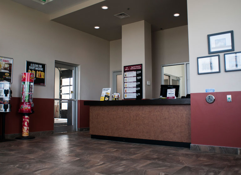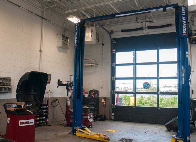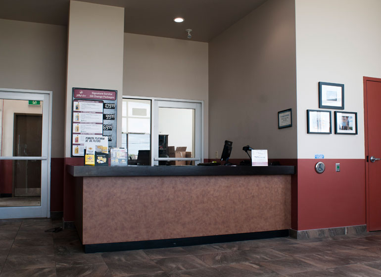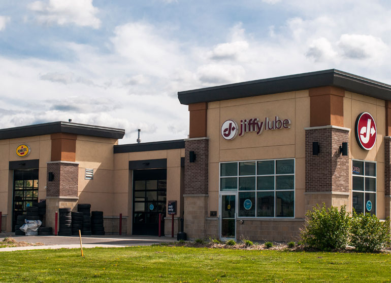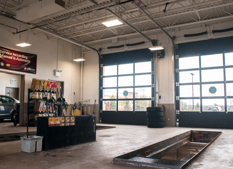 New construction of freestanding, three-bay quick lube service center in partnership with SmartCentres in Kanata, ON. This building features a stucco and stone exterior, flat roof and galley commercial windows.